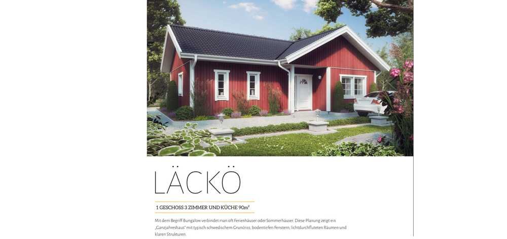Das Läckö ist ein geräumiges, eingeschossiges Haus mit vielen, innovativen und nützlichen Lösungen. Das Haus ist mit einem ungewöhnlich offenen Grundriss geplant worden. Die Kathedraldecke im Wohnbereich ermöglicht die riesigen Fensterflächen zum Garten hin, die ihren Bewohnern besonders viel Licht spenden und ein Gefühl von Größe und Freiheit vermitteln. Vom Wohnzimmer aus gelangt man zu dem überdachten Außenbereich.