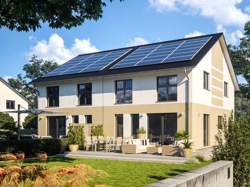 Die geradlinige Architektur dieser Doppelhaushälfte wird durch eine ansprechende Farbkombination aufgelockert und harmonisch in Szene gesetzt. Ein 30° geneigtes Satteldach und ein 2,25 m hoher Kniestock sorgen für ein überraschend großes Raumangebot unterm Dach. Das hervorragende Kosten-Nutzenverhältnis dieser Komponenten überzeugt. Zudem bietet die Dachfläche die optimale Basis für die Nutzung solarer Energie.