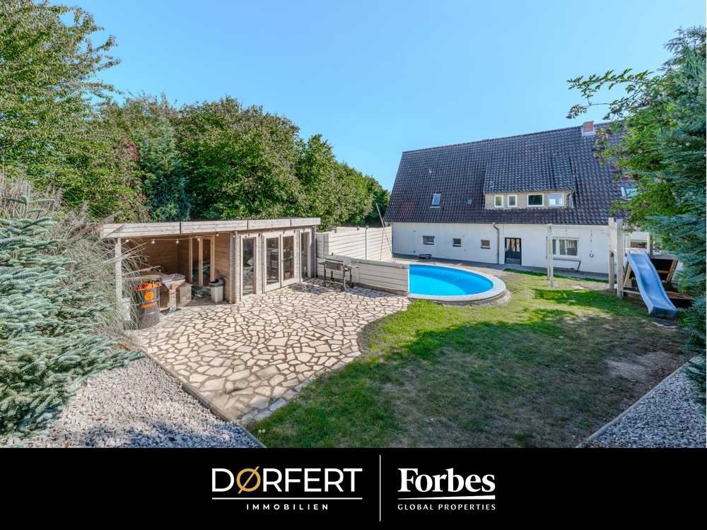 Ein besonderes Highlight ist der 5 Meter große Salzwasserpool, der im großzügigen Garten zu finden ist. Des Weiteren befindet sich dort ein herrliches Gartenhaus mit Überdachung, das sogar eine Ausbauoption zur Sauna bietet. Die Gartennutzung wird durch eine einladende Terrasse abgerundet, auf der man die ruhige Umgebung und den hervorragenden Ausblick über Herford genießen kann. Der in dem Keller vorhandene Partykeller bietet zusätzlich Raum für gesellige Abende.