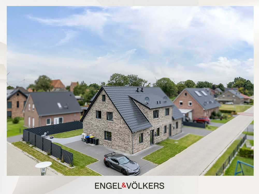 Diese moderne Doppelhaushälfte aus dem Baujahr 2023 überzeugt durch eine zeitgemäße Architektur, hochwertige Bauweise und eine ruhige Wohnlage in Simonswolde, einem Ortsteil der beliebten Gemeinde Ihlow in Ostfriesland. Auf einer Wohnfläche von ca. 110 m² bietet die Immobilie ausreichend Platz für Paare, Familien oder alle, die großzügiges Wohnen zu schätzen wissen. Insgesamt vier Zimmer, ein Badezimmer sowie ein praktisches Gäste-WC sorgen für eine ideale Raumaufteilung und hohen Wohnkomfort. Schon beim Betreten des Hauses fällt die stilvolle Gestaltung auf: Eine elegante schwarze Einbauküche bildet das Herzstück des offenen Wohnbereichs und setzt einen modernen Akzent. Die Fußbodenheizung im gesamten Haus sorgt für behagliche Wärme, während die massive Holztreppe ins Obergeschoss den Wohncharakter auf charmante Weise unterstreicht. Große 3-fach verglaste Fenster lassen viel Tageslicht herein und schaffen zusammen mit den elektrischen Rollläden ein helles, freundliches Wohnambiente. Auch technisch ist das Haus bestens ausgestattet: Eine energieeffiziente Wärmepumpe sowie ein kontrolliertes Be- und Entlüftungssystem gewährleisten nachhaltigen Wohnkomfort. Ein zusätzlicher Dachboden bietet praktische Nutzfläche. Direkt am Haus befindet sich zudem eine großzügige Terrasse, die ideal für entspannte Stunden im Freien und gesellige Abende mit Familie oder Freunden geeignet ist. Das ca. 300 m² große Grundstück eröffnet darüber hinaus vielfältige Möglichkeiten – von zusätzlicher Garten- oder Spielfläche bis hin zu individueller Gestaltung nach Ihren Wünschen. Diese Doppelhaushälfte ist ideal für alle, die modernes Wohnen mit durchdachter Ausstattung und naturnaher Lage verbinden möchten.