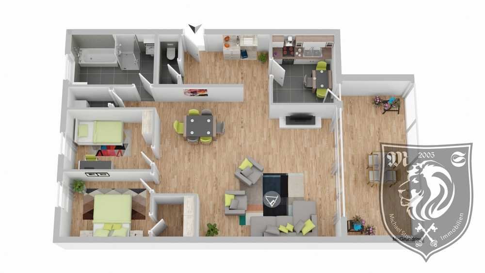 Besonders interessant: Die Gewerbefläche kann in eine Wohnung umgebaut werden. Bei entsprechender Genehmigung wäre eine Aufteilung in zwei Schlafzimmer, ein Badezimmer, ein Gäste-WC sowie einen Waschraum realisierbar. Zusätzlich lässt sich ein großer Wohn- und Essbereich mit Platz für einen Schreibtisch gestalten.