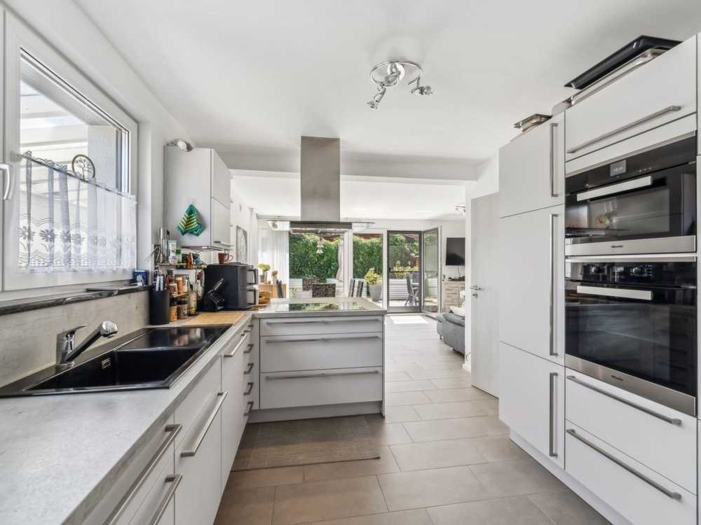 Bereits beim Betreten des Hauses kommen Sie durch den Windfang zum offen gestalteten Wohn-Essbereich mit direktem Zugang zur sonnigen Terrasse. Die hochwertige Einbauküche mit Markengeräten ist nicht nur ein Blickfang, sondern verbleibt im Objekt und bietet sofortige Kochfreude. Eine praktische Speisekammer schafft zusätzlichen Stauraum. Im gesamten Haus sorgt eine Fußbodenheizung für behagliche Wärme.