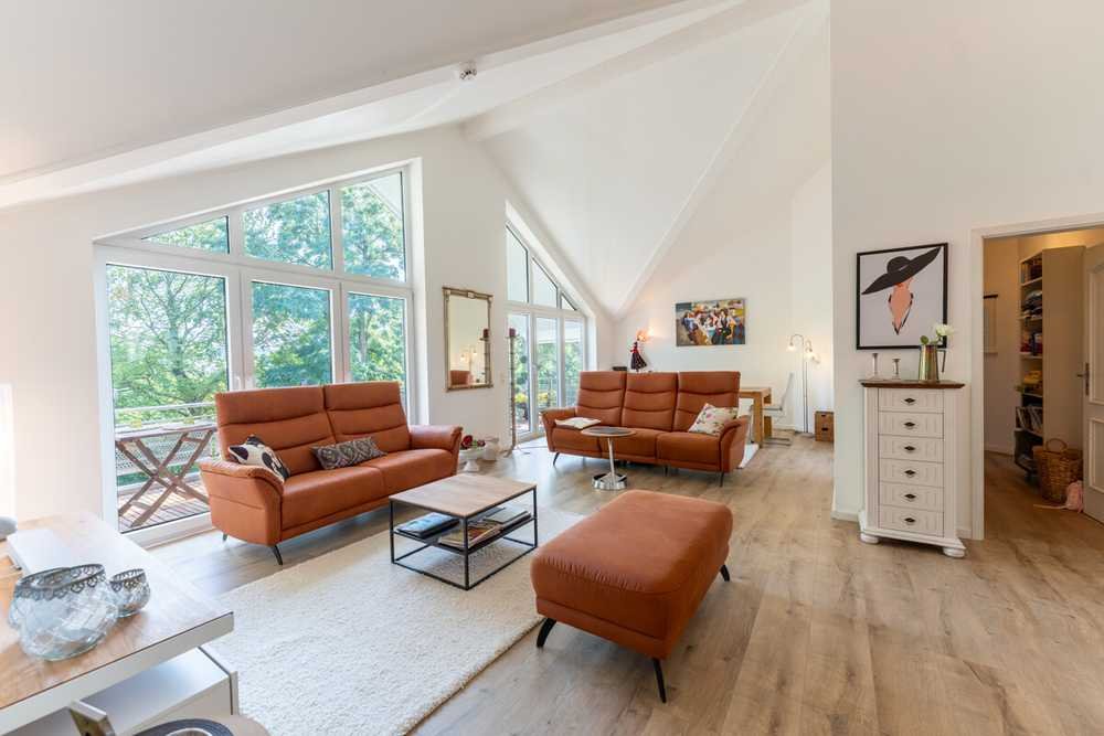 Das Herzstück der Wohnung ist der helle Wohn- und Essbereich mit Zugang zum Balkon, der einen schönen Blick ins Grüne bietet. Besonders hervorzuheben ist die offene Deckenhöhe bis zum Giebel. Eine moderne Einbauküche mit hochwertigen Elektrogeräten, inklusive Weinkühlschrank, ist bereits im Kaufpreis enthalten.
