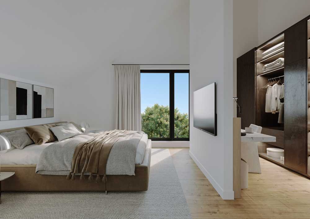 Über den Flur betreten Sie die Wohnung und erreichen zunächst zwei separate Zimmer: ein helles Schlafzimmer und ein weiteres Zimmer, das sich ideal als Büro oder Gästezimmer eignet. Das Schlafzimmer überzeugt mit einer raffinierten Aufteilung – eine halb offene Trennwand gliedert den Raum und schafft Platz für eine großzügige Ankleide. Diese Aufteilung verwandelt das Schlafzimmer in eine private Wohlfühloase mit eigener Ankleide.