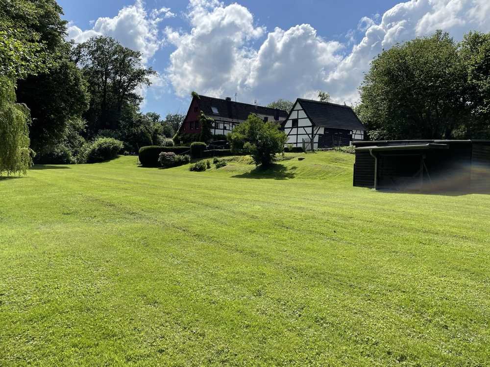 Das weitläufige Grundstück mit Bachlauf und altem Baumbestand (10.000 m²) ist bebaut mit einem Wohnhaus und einer Fachwerkscheune, dem ehemaligen Fuhrwerkshaus.