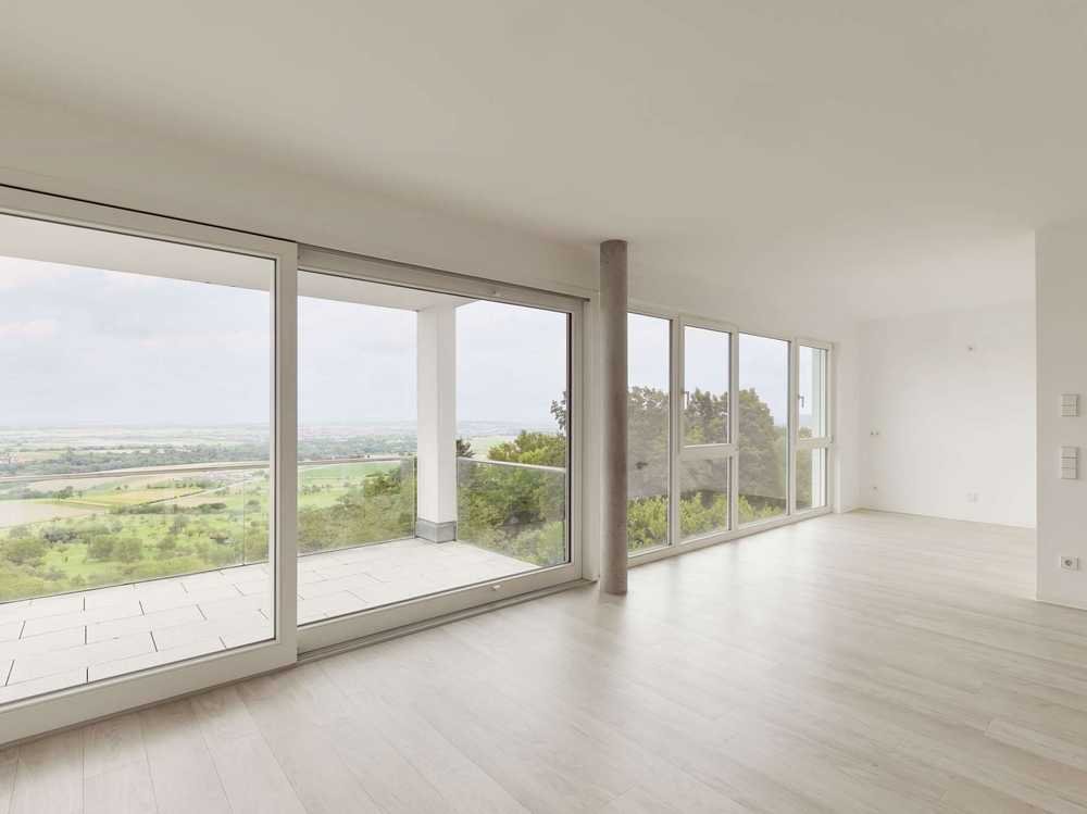 Der großzügige Wohn- und Essbereich mit offener Küche bildet das Herzstück der Wohnung. Bodentiefe Fensterfronten sorgen für ein außergewöhnliches Raumgefühl und lassen den Blick ungehindert in die Ferne schweifen. Der angrenzende, überdachte Balkon mit stilvoller Glasbrüstung erweitert den Wohnraum ins Freie und lädt zu entspannten Stunden mit beeindruckendem Ausblick ein.