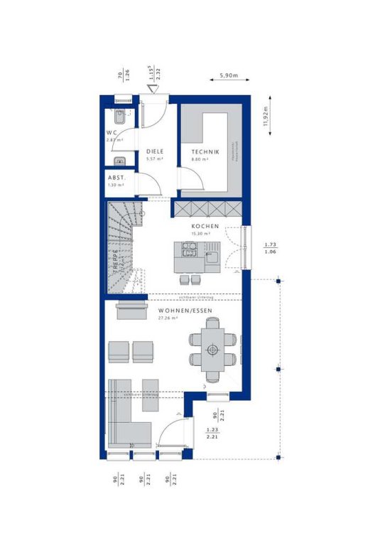 Unser Doppelhaus CELEBRATION 114XLSD ist ein absolutes Platzwunder und bietet durch die bodentiefen Fensterelemente im Erdgeschoss und den WINTERGARTEN nicht nur lichtdurchflutete Räumlichkeiten, sondern dadurch auch ein einmaliges Wohngefühl. Eine große Wohn-Küche, sowie ein offener Wohn-Essbereich sind der ideale Treff- und Lebensmittelpunkt für Ihre Familie und Freunde.