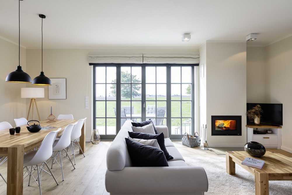 einen lichtdurchfluteten Wohn- und Essbereich mit Kamin, LCD-Flachbildschirm, DVD-Player und Stereoanlage