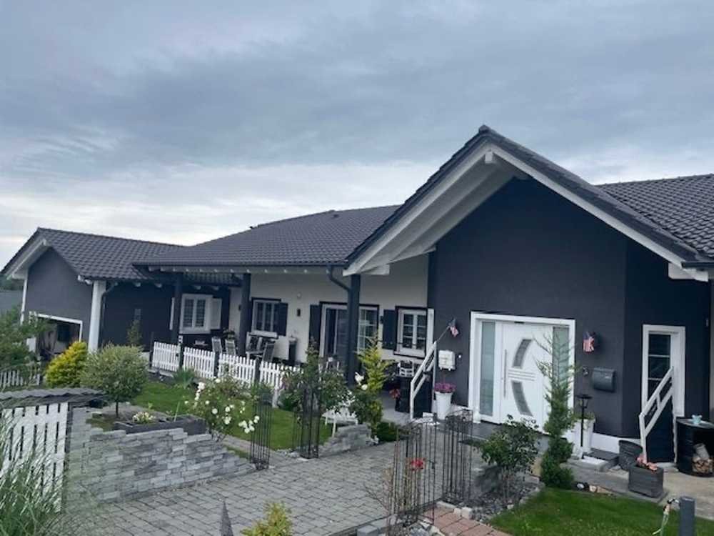 Willkommen in Ihrem modernen, energieeffizienten und hochwertigen neuen Zuhause. Dieser 2020 im amerikanischen Baustil in Massivbauweise erbaute Bungalow mit großzügigen überdachten Veranden, offener Raumgestaltung sowie einem großzügigen Wohnbereich, großem Schlafzimmer und Masterbad ist ein absolutes Highlight und eine Seltenheit und bietet sämtlichen Komfort. Das ca. 647 m² große, sonnige Grundstück erstreckt sich anteilig um Ihre Bungalow-Hälfte herum und wurde liebevoll von den Eigentümern angelegt. Über einen geräumigen Windfang, welcher genügend Platz für eine Garderobe bietet betreten Sie die Wohnung. Durch eine Doppelflügeltüre betreten Sie das großzügige Wohnzimmer mit Kaminanschluss. Hier sorgen großzügige Fensterfronten für reichlich Tageslicht. Vom Wohnzimmer haben Sie Zugang auf die überdachte ca. 40 m² Terrasse und in den Garten. Die Wohnküche, welche Sie über einen breiten Durchgang vom Wohnzimmer aus erreichen verfügt über eine hochwertige Einbauküche mit Marken-Elektrogeräte und bietet sämtlichen Komfort. Eine Kücheninsel mit Sitzgelegenheiten schafft reichlich Platz und lädt zum gemütlichen Beisammenseins ein. Von der Küche aus können Sie direkt eine weitere, ca. 20 m² großen Ostterrasse sowie den Garten betreten. Zusätzlich gibt es eine erhöhte, dritte Terrasse von hier genießen Sie einen herrlichen Ausblick und es lässt sich die Abendsonne bei einem Gläschen Wein genießen. Über den breiten Flur erreichen Sie das großzügige Schlafzimmer. Das Masterbad verfügt ebenfalls über ein Fenster. Hier bietet sich reichlich Platz und eine Wellnessoase mit großzügiger Badewanne in der Sie die Seele baumeln lassen können. Durch eine Wand separiert befindet sich die bodentiefe Dusche sowie die Toilette und der Waschmaschinenanschluss. Zwei weitere Räume mit Fenster sowie ein Gästebad, Toilette und Dusche stehen zusätzlich zur Verfügung. Eine Ankleide, aktuell als Büro genutzt, komplettiert das Platzangebot. Im gesamten Haus wurden hochwertige Materialien verbaut. Typisch für diesen Baustil erstreckt sich die überdachte Hauptterrasse in herrlicher Südausrichtung über die gesamte Länge des Bungalows und bieten reichlich Platz mit ca. 40 m². Zu der Doppelhaushälfte gehört eine ca 45 m² große Doppelgarage mit elektrischem Rolltor sowie 2 Stellplätzen davor. Sie können die Garage unmittelbar von der Küche betreten. Das Dachgeschoss bietet Ausbaupotenzial, was eine zusätzliche Fläche von ca. 50 m² ergeben würde. Eine Regenwasserzisterne sorgt für reichlich Wasserreserve, welches zur Bewässerung des Gartens genutzt werden kann. Hier stehen Anschlüsse um das Haus zur Verfügung. Das Haus wird mit einer Luftwärmepumpe des Herstellers Viessmann beheizt welche die Fußbodenheizung mit Wärme versorgt. Sämtliche Fenster und Türen sind 3-fach verglast (+ Fliegengitter) und verfügen über Jalousien, welche an den Türen elektrisch betätigt werden können. Der liebevoll angelegte Garten lädt zum Verweilen ein. Hier lassen sich ungestörte Stunden im Freien genießen. Der Energieausweis liegt zur Besichtigung vor.