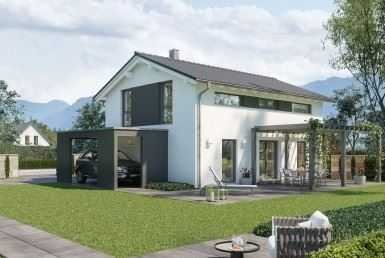 Mit der Pergola und dem Carport in der Kontrastfarbe entsteht ein auch optisch herausragendes Haus.