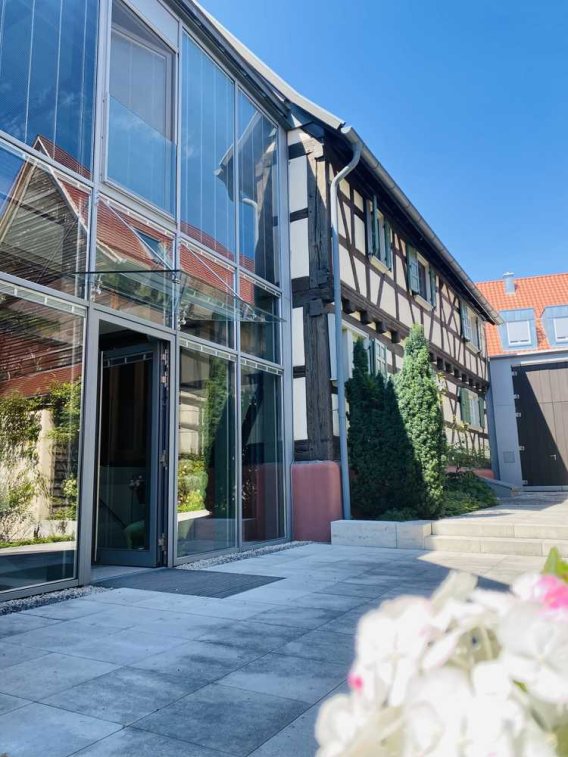 Das Objekt mit seinen 340 m² Wohnfläche gliedert sich in das historische, sanierte Fachwerkhaus, einem Glasatrium und dem modernen Architektenanbau.