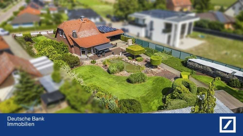 Das parkähnliche Grundstück inszeniert Wohnen im Grünen: Ein idyllischer Teich, großzügige Sitzplätze, eine automatische Bewässerungsanlage und die ca. 30 m² große Süd-Terrasse aus Buche-Thermoholz schaffen einen Ort zum Entspannen. Eine elektrische Großmarkise (ca. 5 × 4 m, HEIM & HAUS, 2022) sorgt für angenehmen Schatten und verlängert die Gartensaison.