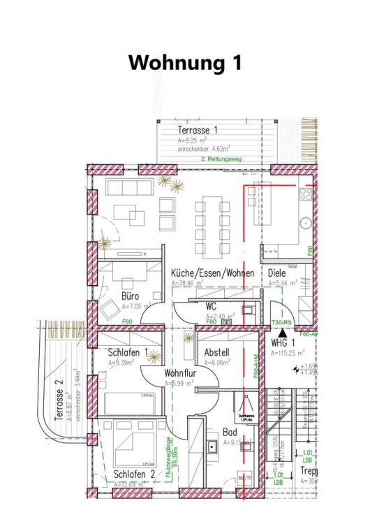 Das Angebot bezieht sich auf die Wohnung 1 im Erdgeschoß. Sie gelangen über eine geräumige Diele mit Garderobe in die Wohnung. Von der Diele gelangen Sie in das Gäste-WC sowie in den das Büro von ca. 8 m². Ebenso gelangen Sie in hellen geräumigen Wohn/Eßbereich mit offener Küche von ca. 30 m² sowie auf die sonnige Terrasse von 11 m² sowie in den eigenen Garten Über den Wohnbereich gelangen Sie in den separaten Schlaftrakt. Dieser besteht aus dem geräumigen Bad mit Fenster von ca. 9 m² ausgestattet mit Dusche und Wanne, dem gut aufgeteilten Elternschlafzimmer von ca. 13 m², dem funktionellen Hauswirtschaftsraum von . 6 m² sowie dem hellen Kinderzimmer/Büro von ca. 10 m² mit Zugang auf die zweite Terrasse sowie in den Garten. Die Wohnung hat eine Wohnfläche von ca. 109 m². Der Wohnung ist ein Kellerraum zugeordnet.