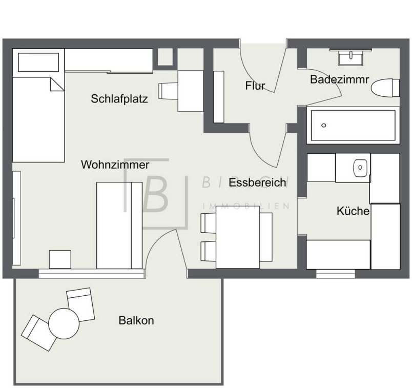 Das Herzstück der Wohnung ist der helle Wohn-Schlafbereich, der durch den direkten Zugang zum Balkon eine besonders einladende Atmosphäre schafft. Hier lässt sich der Tag entspannt beginnen oder in ruhiger Umgebung gemütlich ausklingen.