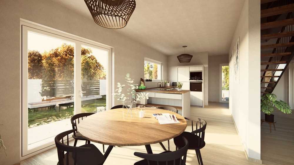 Mit rund 135 m² auf zwei Ebenen bietet es ausreichend Platz, damit sich die ganze Familie langfristig wohlfühlen kann. Im Erdgeschoss wartet ein heller, offener Wohn-Ess-Kochbereich, der durch seine freundliche Atmosphäre zum gemeinsamen Zusammensein einlädt. Praktische Details wie ein Gäste-WC und ein großzügiger Hauswirtschaftsraum sorgen dafür, dass der Alltag entspannt bleibt.