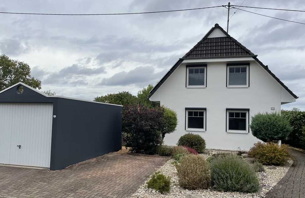 Fertiggarage mit Starkstromanschluss, bereit für die Installation einer Wallbox, zusätzlicher Stellplatz neben der Garage.