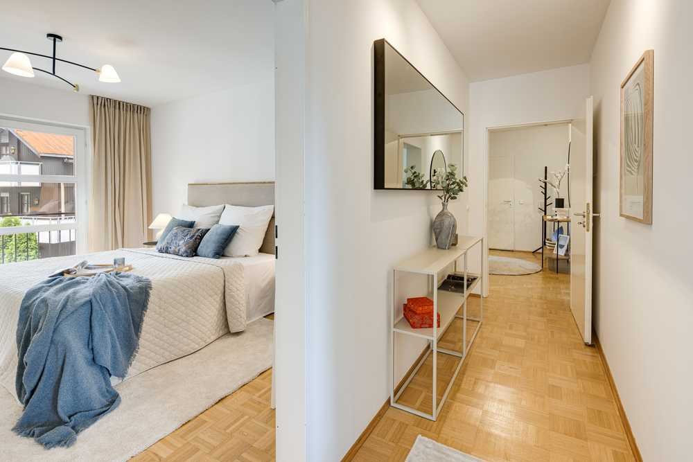 Die Ausstattung überzeugt durch hochwertige, zeitlos gewählte Materialien. Der massive Eichenholz-Parkettboden in den Wohn- und Schlafräumen harmoniert geschmackvoll mit den elegant verlegten Natursteinfliesen in Bad, dem WC und der Küche. Die Materialauswahl unterstreicht das gehobene Wohnambiente und den nachhaltigen Qualitätsanspruch.