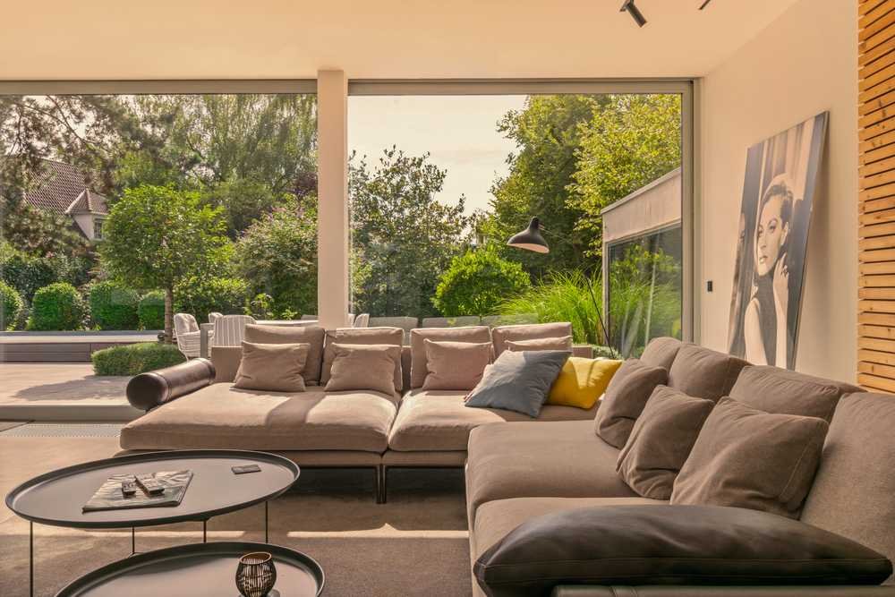 ca. 75 m² offener/stützenfreier Wohn-/Essbereich mit vollverglaster elektrischer Schüco-Fassade & 360 Grad drehbarem Designer Kamin der Marke Focus