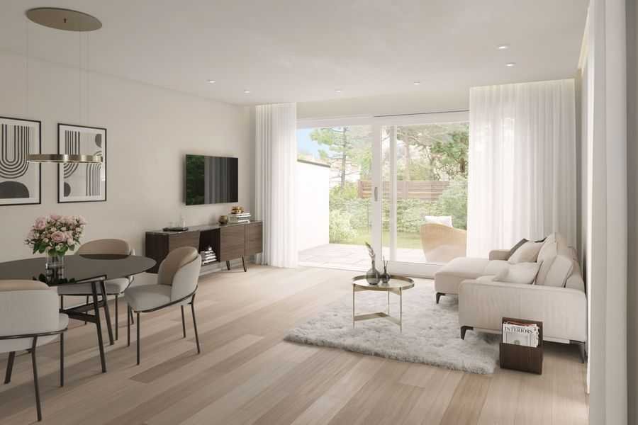 Das Herzstück der Wohnung bildet der offene Wohn- und Essbereich mit Küche, der sich über große Fensterflächen zur Terrasse und in den Garten öffnet – perfekt für entspannte Abende oder lebendige Familienmomente.