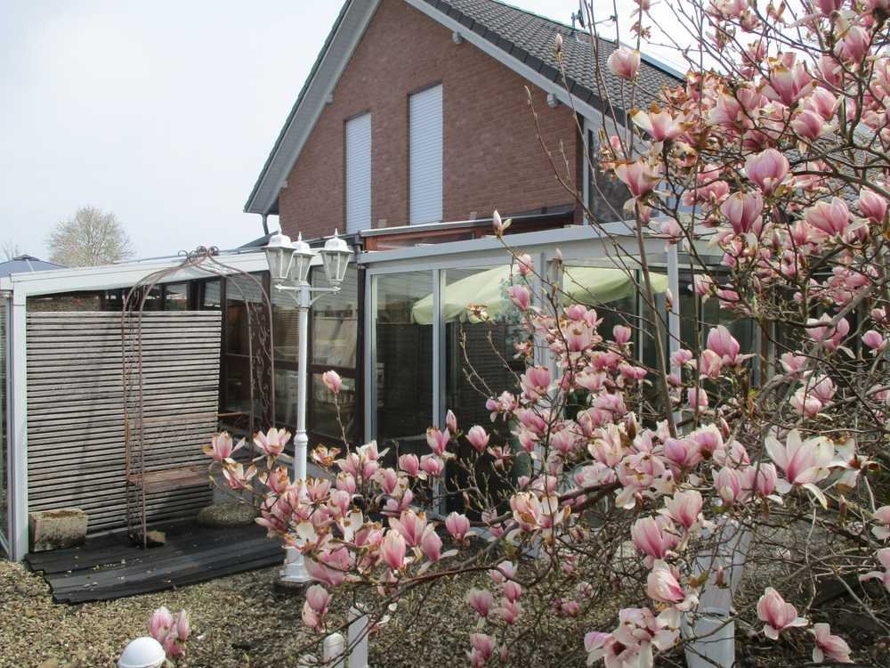 Darüber hinaus wurde durch einen Anbau ein zusätzlicher, ca. 38,8 qm großer Raum gewonnen, von dem aus der Wintergarten II mit angrenzender überdachter Terrasse begangen werden kann. Die Nutzung dieses Raumes ist optimiert dadurch, dass es in diesem eine Wasser- und Herdanschlussmöglichkeit gibt, um eine kleine Küchenzeile einrichten zu können. Alternativ dazu könnte ein drittes Bad installiert werden.