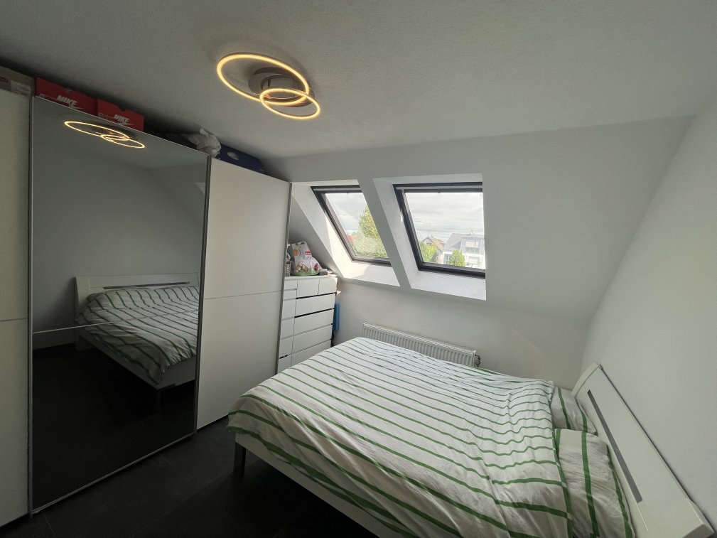 Auf rund 91 m² Wohnfläche netto (ca. 115 m² brutto inkl. Schrägen, Balkon und Treppenhaus) verteilt auf zwei Etagen erwarten Sie ein großzügiger Wohn-/Essbereich mit Zugang zum Balkon, ein helles Schlafzimmer, ein Kinder- oder Arbeitszimmer sowie ein zusätzliches halbes Zimmer, das sich flexibel nutzen lässt.