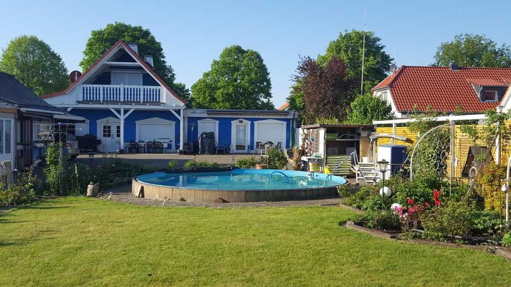 Der Außenbereich begeistert mit einem großen eingelassenen Pool, überdachtem Terrassenbereich, gepflegten Selbstversorgerbeeten, zahlreichen Sitzgelegenheiten und viel Platz zum Genießen und Entspannen.