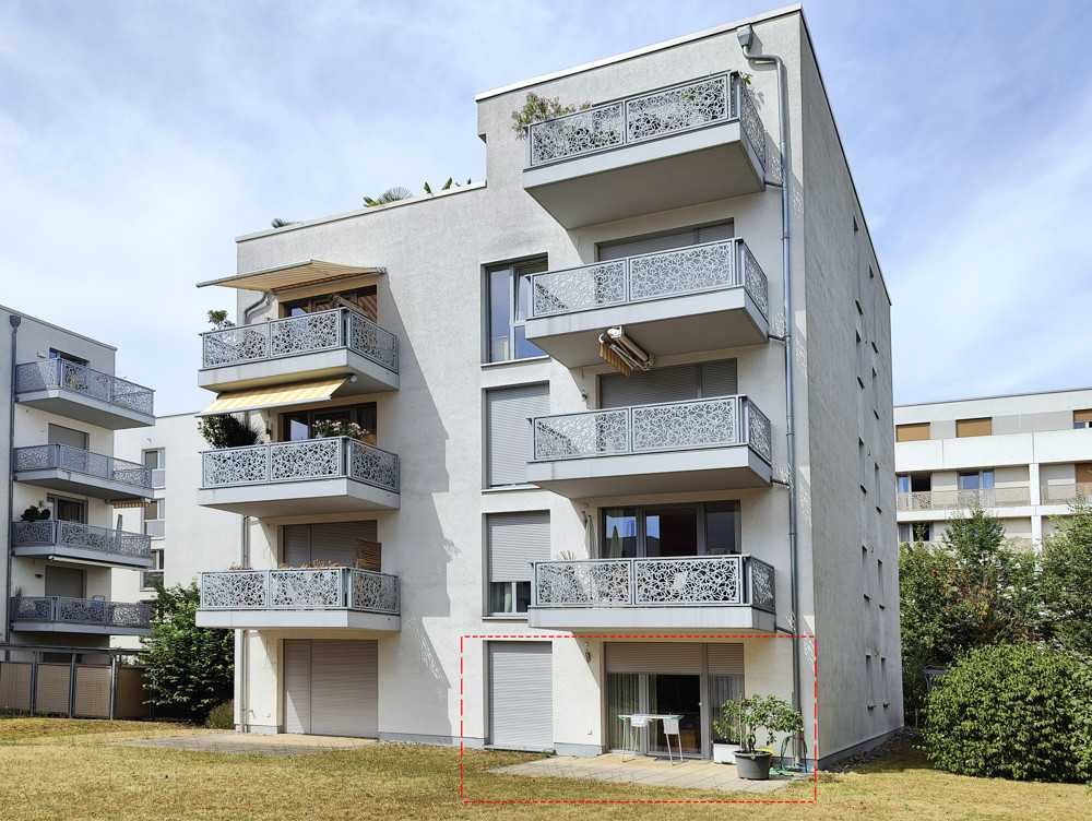 Das helle und großzügig geschnittene Wohnzimmer bildet das Herzstück der Wohnung. Bodentiefe Fenster lassen viel Tageslicht herein und ermöglichen den direkten Zugang zur geräumigen Terrasse. Diese bietet nicht nur Platz für gemütliche Sitzbereiche, sondern öffnet sich zu einer weitläufigen, parkähnlich angelegten Grünfläche – ein grüner, ruhiger Rückzugsort direkt vor der Tür, der den Wohnkomfort spürbar erhöht.