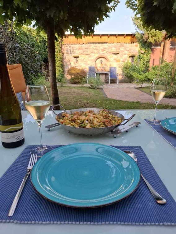 Die beiden Wohnhäuser öffnen sich zu einem romantischen Innenhof und einem malerischen Garten, der von einer Mauer mit historischen Elementen der alten Burgmauer umgeben ist.