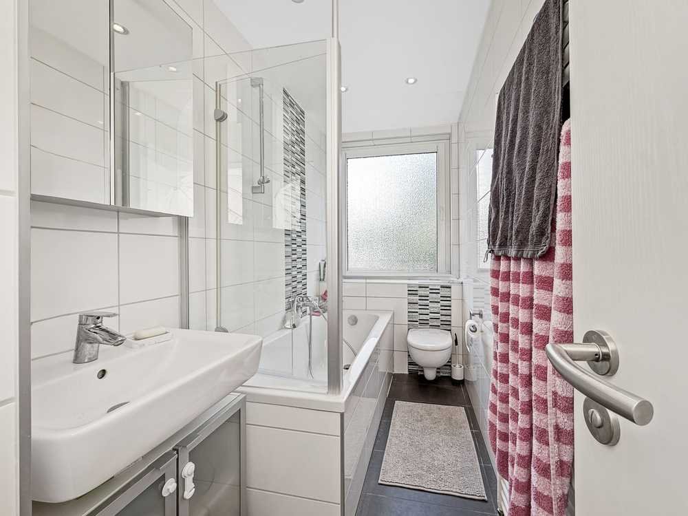 Das Badezimmer überzeugt mit großformatigen, hellen Fliesen, die bis zur Decke reichen, und ist mit einer praktischen Dusch-Badewanne ausgestattet. Ergänzt wird der Komfort durch eine elektrische Fußbodenheizung im Bad, die für eine angenehme Wärme sorgt. Auch in der Küche wurde an alles gedacht: Die moderne Einbauküche inklusive weißem, großformatigem Fliesenspiegel ist bereits im Kaufpreis enthalten.