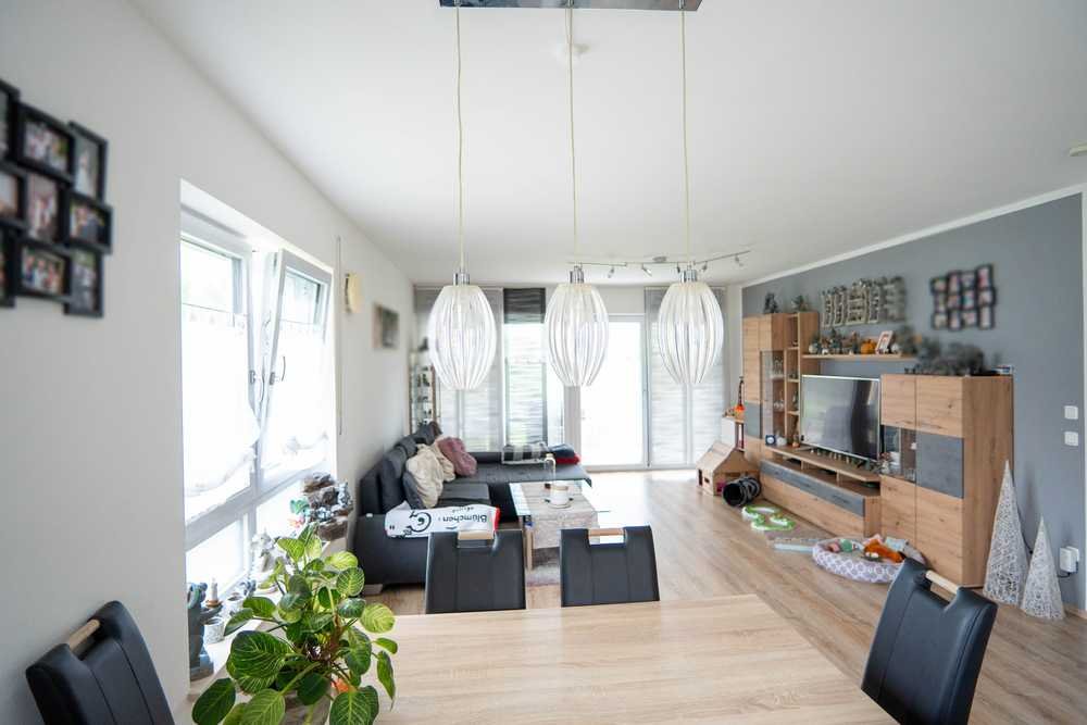 Nachdem Sie Ihr Auto in der Einzelgarage oder dem Carport geparkt haben (zzgl. 30.000€) – geht es direkt in wenigen Metern zum Haus und weiter in die hell gestaltete Wohnung. Bereits beim Betreten überzeugt die durchdachte Raumaufteilung: Der Eingangsbereich führt zur linken Seite in den offenen Wohn- und Essbereich mit angrenzender Küche. Die moderne Einbauküche wird durch eine praktische Speisekammer ergänzt – ideal für alle, die gerne kochen und Ordnung lieben.