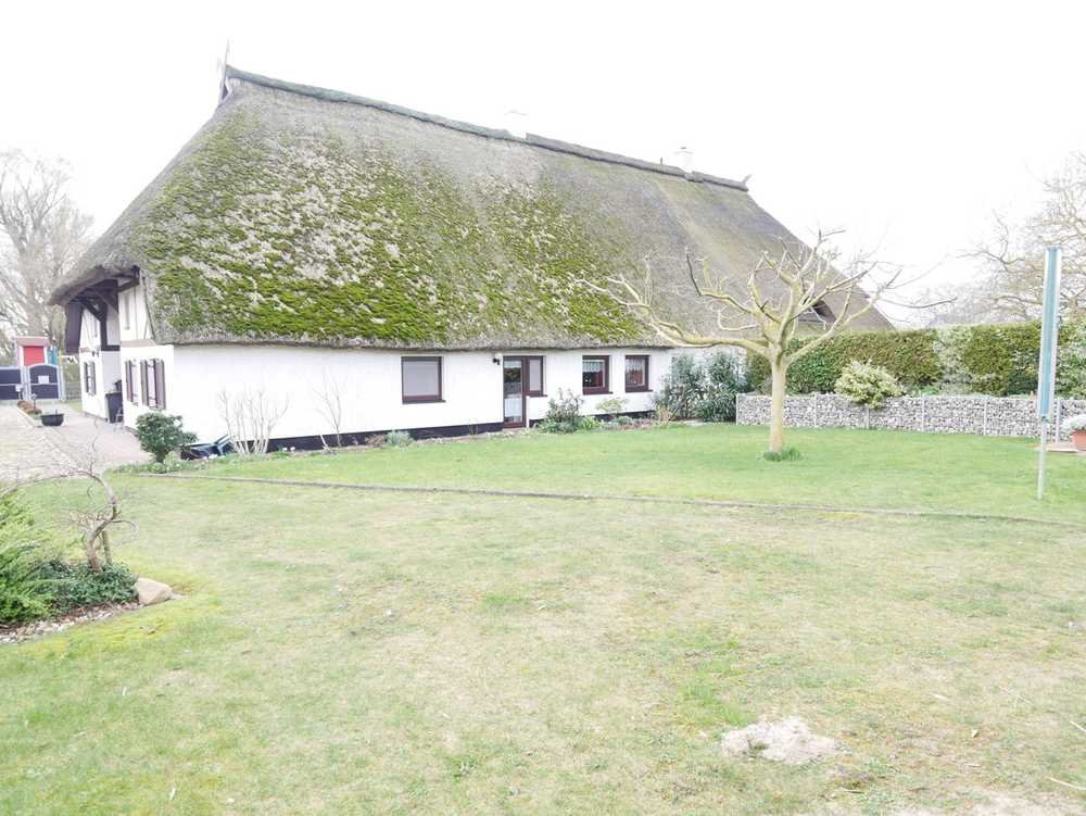 Diese außergewöhnliche, reetgedeckte Doppelhaushälfte mit Einliegerwohnung versprüht bereits ihren Charme beim Betreten des Hauses durch die exklusive offene Galerie. Insgesamt verteilen sich ca. 230 m² Wohnfläche auf Erd- und Obergeschoss. Im Erdgeschoss gibt es insgesamt vier Zimmer, Küche mit Einbauküche, Duschbad mit Hauswirtschaftsraum, Gästetoilette, die große Diele mit Esszimmer, Windfang, Hausanschlussraum für die Heizung sowie die Einliegerwohnung mit zwei Zimmern, Pantry-Küche und einem Duschbad. Man könnte allerdings die Einliegerwohnung problemhaus wieder zur Hauptwohnung integrieren. Im Obergeschoss befinden sich drei weitere Zimmer, ein Duschbad mit Whirlpool, eine Sauna und noch eine zusätzliche Ausbaureserve. Die Wärmepumpe wurde 2024 verbaut, im Erdgeschoss gibt es zudem eine Fußbodenheizung. Die Fenster sind aus Holz und wurden von außen mit Alu beschichtet, das Haus wurde 1996 einer Komplettsanierung unterzogen.
