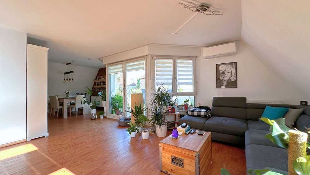 Das großzügige Wohn- und Esszimmer bildet das Herzstück dieser stilvollen Maisonettewohnung und überzeugt sofort mit seiner offenen Gestaltung, modernem Vinylboden und einer lichtdurchfluteten Atmosphäre. Von hier aus gelangen Sie direkt auf die sonnige Loggia, die mit einer elektrischen Markise ausgestattet ist – ideal, um den Blick über Brackenheim zu genießen oder entspannte Stunden im Freien zu verbringen.