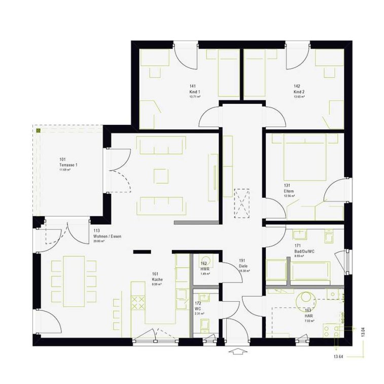 Diesen Bungalow können Sie mit uns auf dem beschriebenen Grundstück bauen. Durch unsere kurzen Bauzeiten werden Sie bereits nach wenigen Monaten in dieses tolle Haus einziehen. Dadurch lassen sich all Ihre Wünsche verwirklichen. Mit ca. 138 m² Wohnfläche bietet es Platz für die ganze Familie.