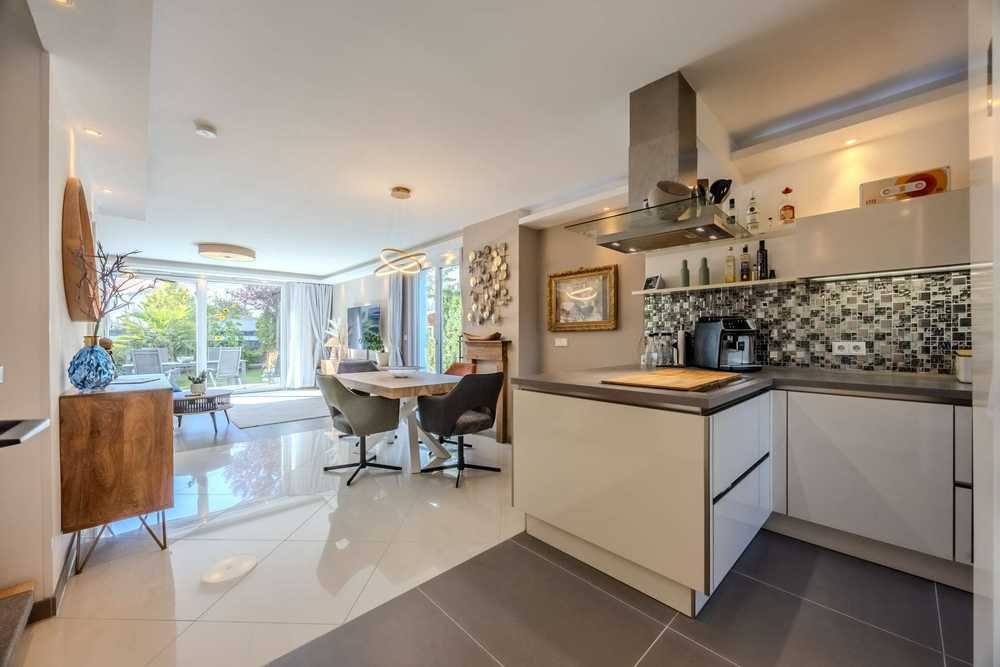 Im Erdgeschoss empfängt Sie ein einladender Eingangsbereich mit Gäste-WC, der in den weiten, offenen Wohn-/Essbereich überleitet. Die hochwertige, offene Einbauküche fügt sich harmonisch in den Wohn- und Essbereich ein. Bodentiefe Fenster öffnen den Blick auf Terrasse und Garten und schaffen ein helles, freundliches Wohnambiente.