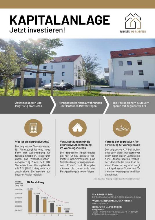 - Degressive AfA (5 % jährlich) für hohe Steuerersparnis in den ersten Jahren – gesetzlich verankert durch das Wachstumschancengesetz (§ 7 Abs. 5 EStG)