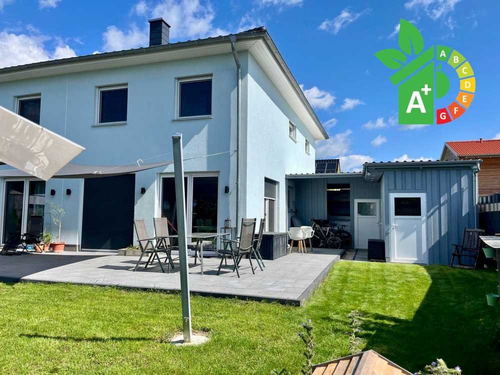 Das Haus besticht durch seine hervorragende Energieeffizienz (A+, Bedarfsausweis, Endenergiebedarf: nur 20,8 kWh/(m²a)) sowie eine nachhaltige Zentralheizung mit Strom als Energieträger. Insgesamt stehen fünf helle Zimmer, zwei stilvolle Badezimmer sowie eine moderne Einbauküche zur Verfügung. Das Haus verfügt außerdem über ein Außen-WC mit Dusche und einen Kaminofen im Wohnbereich.