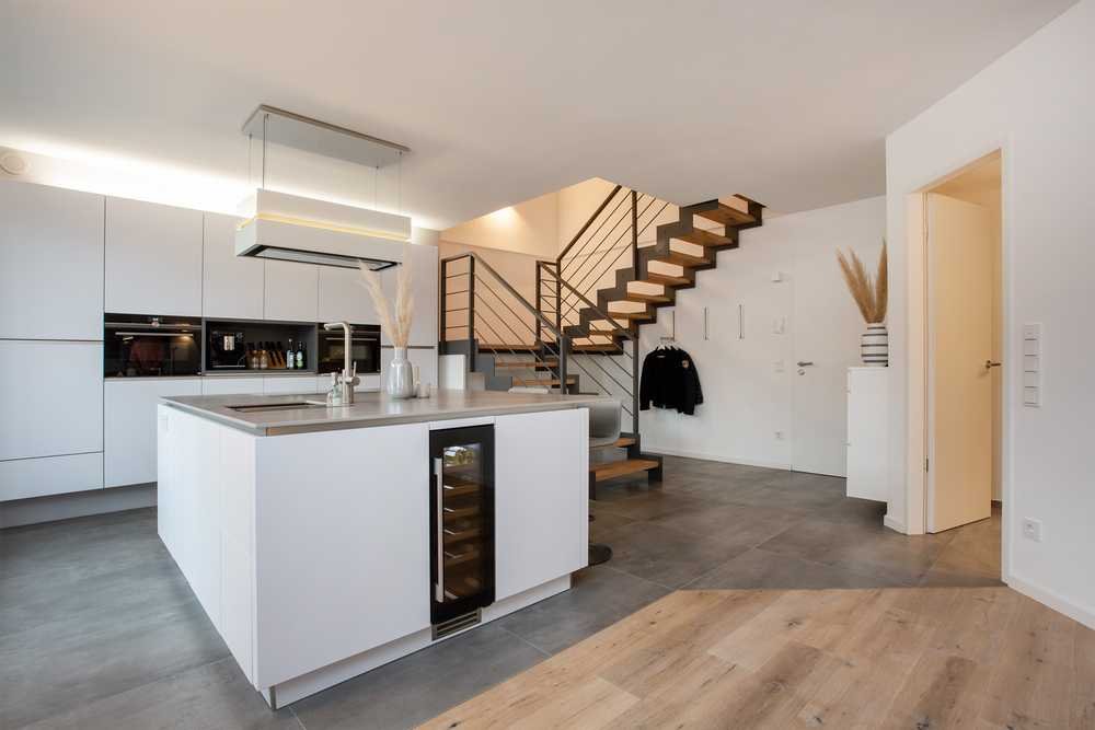 Das Herzstück der Wohnung bildet der weitläufige Wohn- und Essbereich mit einer maßgefertigten Häcker-Küche, ausgestattet mit modernsten Siemens-Geräten und einer eleganten Berbel Skyline Dunstabzugshaube – eine perfekte Symbiose aus Funktionalität und Design. Hochwertige Materialien wie Eichenparkett, edle 80x80 Bodenfliesen sowie die stilvolle Eichentreppe mit lackiertem Stahlwangen-Träger (DB703) unterstreichen den exklusiven Charakter dieser Immobilie. Ergänzt wird dies durch maßgefertigte Einbauten vom Tischler, die Stauraum elegant in das Wohnkonzept integrieren und die Wohnqualität weiter steigern.