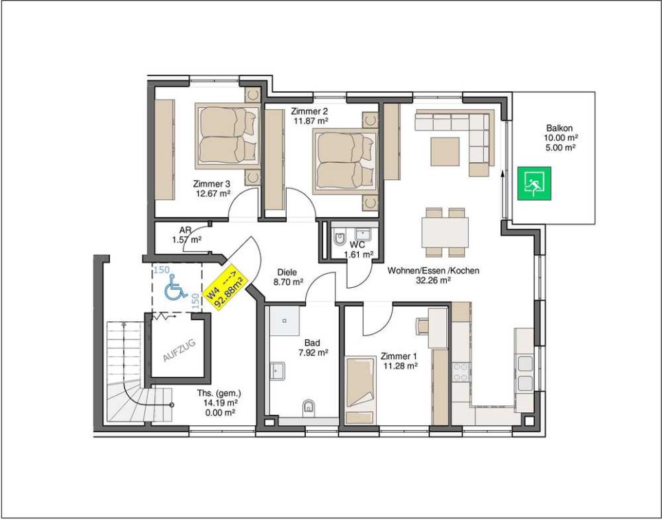 Die Wohnung ist barrierefrei zugänglich und verfügt über einen großzügen Wohn/Ess- und Kochbereich, Badezimmer, Gäste-WC, Abstellraum und drei Schlafräume.