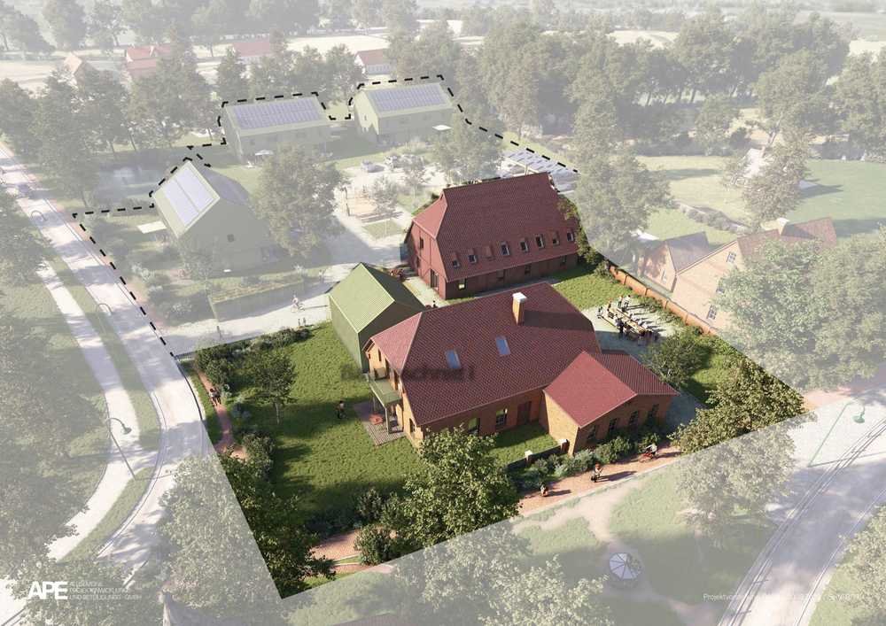 Das aktuelle Konzept sieht vor, die historische Dorfschule wirtschaftlich effizient zu revitalisieren und rund 250 qm Wohnfläche zu schaffen. Die angrenzende, regionaltypische Scheune wird in gleicher Kubatur wieder aufgebaut und ebenfalls als Mehrfamilienhaus mit rund 250 qm Wohnfläche umgenutzt. Für beide Objekte liegt eine vollständige Planung samt Baugenehmigung vor.