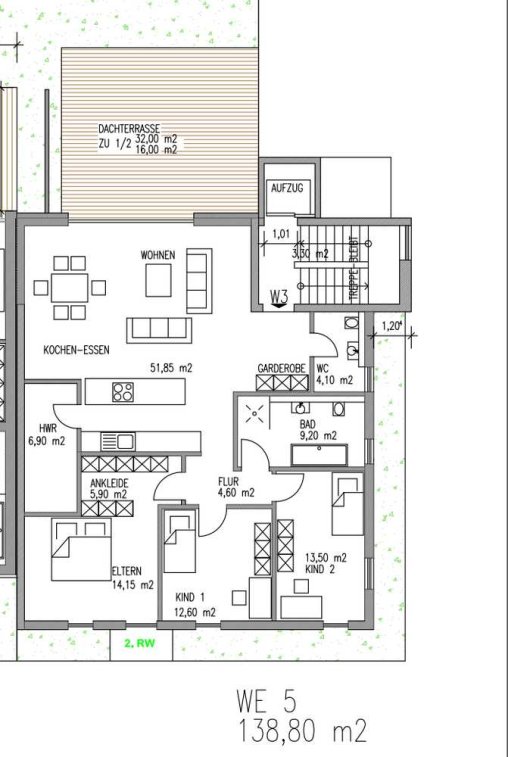 Das Angebot bezieht sich auf die Penthousewohnung 5 im Dachgeschoß des Hauses 20 c. Die Wohnung besteht aus dem großzügigen Bereich Wohnen/Essen/Kochen von ca. 51 m² mit Zugang zur großen Dachterrasse von ca. 32 m². Dem Bereich Kochen in ein funktionaler Abstellraum zugeordnet . Von der zentralen Diele mit Garderobe erreichen Sie das Gäste-WC, geräumige Elternschlafzimmer mit Ankleide von insgesamt ca. 20 m², das schöne Kinderzimmer von ca. 14 m² sowie das Büro von ca. 13 m². Ebenfalls über die Diele ist moderne Bad mit Fenster von ca. 9 m² erreichbar. Dieses kann wahlweise mit einer großen flachen Dusche oder einer Wanne ausgestattet werden. Die Wohnfläche beträgt ca. 139 m² .