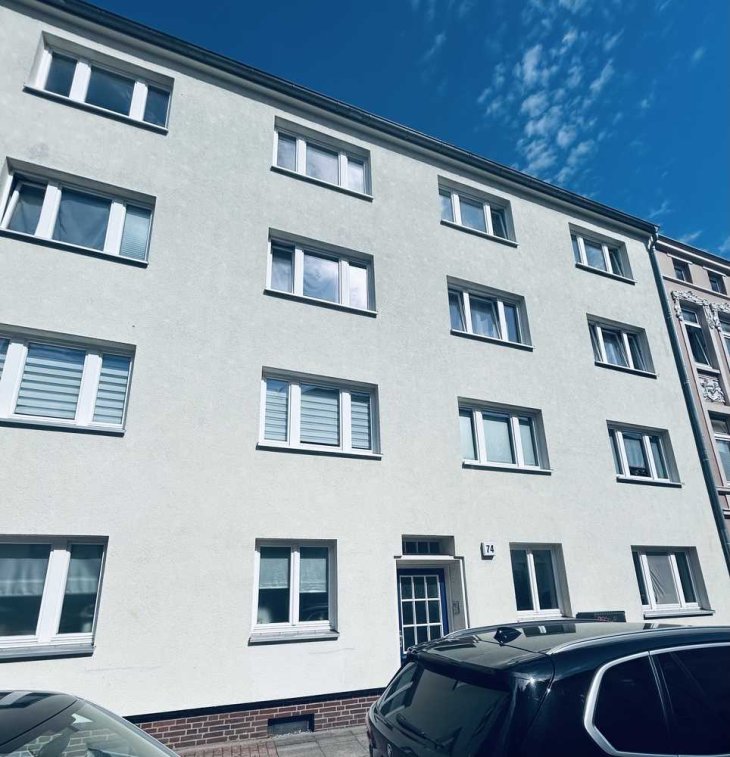 Das 1954 erbaute Gebäude verfügt über insgesamt 20 Wohnungen verteilt auf zwei Eingänge. Die Wohnung befindet sich in der Nr. 74. Im Jahr 2001 wurden die Häuser umfassend modernisiert. Sie erhielten neben einer Wärmedämmverbundfassade, wodurch die Wärmedämmung grund-legend verbessert wurde, auch einen freundlichen hellen Anstrich. Die vor-handenen Balkone wurden erneuert und als Kontrast zur übrigen Fassade mit blauen Einfassungen versehen. Die alte Heizung wurde gegen eine moderne Gaszentralheizung ausgetauscht. Die Eigentumswohnung im Dachgeschoss wurde 2013 ausgebaut und komplett renoviert.