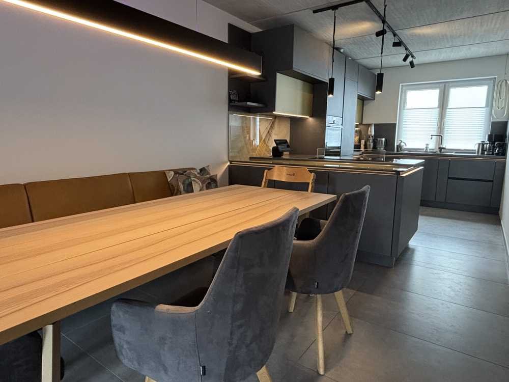 Die Immobilie verfügt über insgesamt fünf Zimmer, was eine flexible Nutzung ermöglicht, sei es als Familie oder als Single mit viel Platzbedarf. Ein besonderer Blickfang ist die Loft-Optik mit Betondecken im Erdgeschoss, bestehend aus einer matt schwarzen, offenen Küche mit angrenzendem Wohn-/Essbereich und Garten mit großzügiger Terrasse, Teich sowie Gartenhaus. Ein modernes Gäste-WC und ein einladender Flur vervollständigen das Gesamtbild.