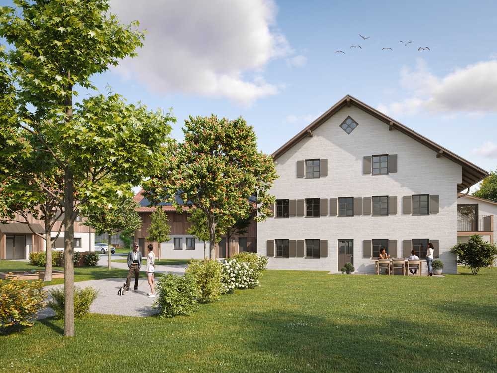 Prägnant aber zurückhaltend ist das denkmalgeschützte Bauernhaus stilprägend für die Entwicklung des Neubau-Ensembles mit nur 12 Wohneinheiten auf dem über 3.200 m² Grundstück eines denkmalgeschützten Bauernhofes. Vielfältige Wohnformen für Jung und Alt schaffen ein generationenverbindendes Zuhause mit dem Ensemblecharakter einer alten Hofstatt.