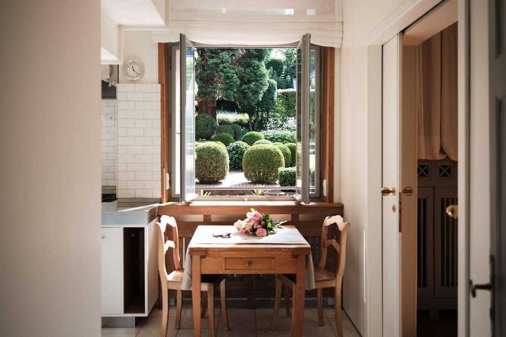 Durch die leichte Hanglage betritt man den Keller bzw. die Garage des Hauses ebenerdig, der Garten befindet sich jedoch im ersten Geschoss, das man über den Haupteingang direkt erreicht. Über antike Eingangstüren mit Buntglas betritt man den sternförmigen Flur, der Zugang zu allen Zimmern bietet und über einen wunderschönen, dunkelgrünen Kamin verfügt, der sich direkt gegenüber dem Eingang befindet. Auf der Westseite, der Vorderseite des Hauses, befinden sich drei sehr große, repräsentative Räume mit fast 4m hohen Decken, Stuck und perfekt aufgearbeiteten Holztüren und -Fenstern. Alle sind miteinander verbunden und sorgen, durch die großen Schiebetüren, für eine beeindruckende Atmosphäre. Das kleinste der Zimmer wurde zuletzt als Arbeitszimmer genutzt, die anderen beiden eignen sich als repräsentative Wohnzimmer. Der Rest der Fläche verteilt sich auf die große Küche und das angebundene Wohn- bzw. Esszimmer. Beide mit Blick in den spektakulären Garten. Im Zimmer an der Küche befindet sich ein zweiter, antiker Kachelofen und der Zugang zur Terrasse und dem Garten. Die Küche auf der Rückseite des Hauses ist ausgesprochen geräumig und mit klassischen Edelstahl-Elementen ausgestattet. Ein Gasherd, ein doppelseitiger Kühlschrank und diverse Einbauten mit praktischen Schubladen sind ebenfalls enthalten und bieten jederzeit die Möglichkeit, größere Empfänge mit mehreren Gästen zu veranstalten. An die Küche grenzt zudem eine Vorratskammer und sie bietet Platz für einen kleinen Tisch. Über die gesamte Breite blickt man in den liebevoll angelegten Garten, der aus zwei Ebenen besteht und die ideale Balance zwischen naturbelassenen Elementen und klarer Struktur schafft. Die untere Ebene, direkt an die große Terrasse, umschließt den runden Brunnen in der Mitte. Die zweite Ebene befindet sich weiter hinten auf dem Grundstück und ist über eine kleine Treppe zu erreichen. Sie wird teilweise von einem beeindruckenden, etwa 20 Meter hohen Baum verdeckt und wäre der ideale Platz für einen Pool. Dort befindet sich auch ein wunderschönes, gemauertes Gartenhaus mit Gewächshaus, das die Backstein-Fassade des Wohnhauses a