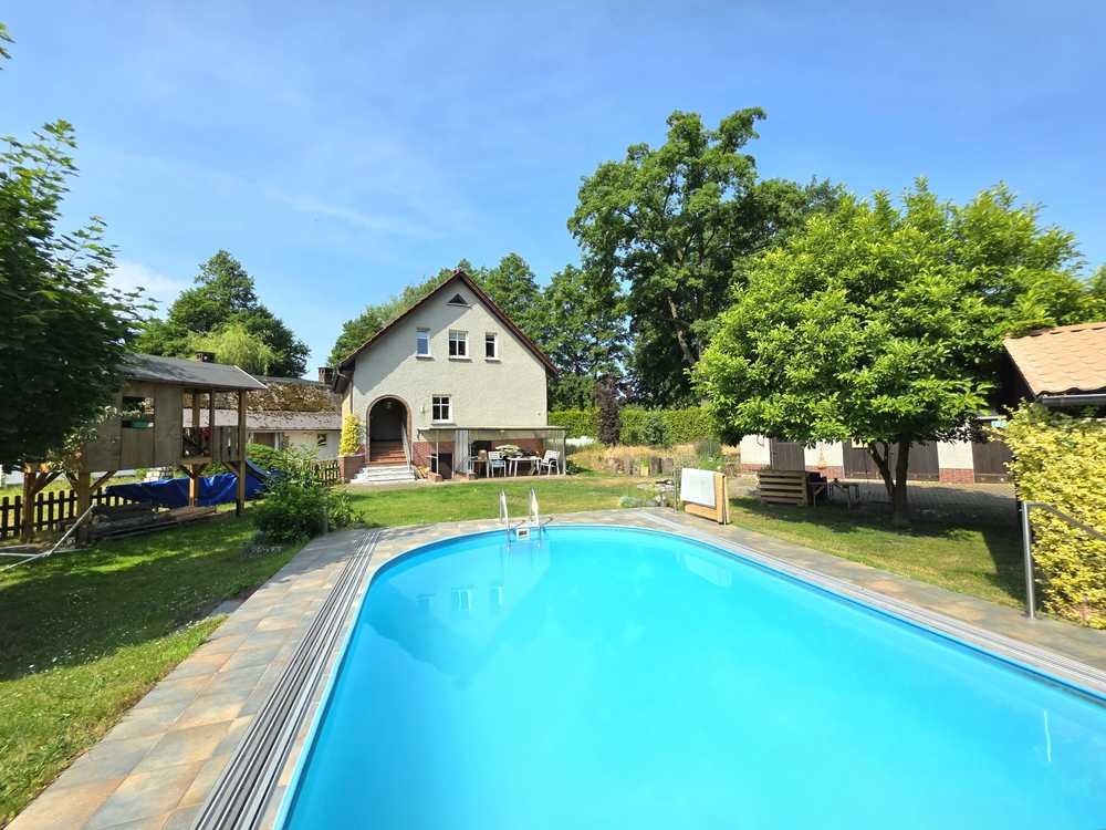 Das massiv errichtete Wohnhaus wurde ca. 1988 erbaut und fortlaufend modernisiert. So wurden 2005 der Kachelofen, 2011 die Küche und 2015 die Dacheindeckung inkl. Dämmung erneuert. In der Zeit von 2020 bis 2021 erfolgten zudem umfangreiche Modernisierungen an der E-Anlage, den Fenstern und dem Bad im Obergeschoss. Abschließend wurden neue Innentüren verbaut und der Innenbereich umfangreich renoviert. Auf ca. 122 m² erwartet Sie hier die perfekte Grundlage für Ihr Familienglück. Im Erdgeschoss empfängt Sie der zentrale Flur mit Zugang zu einem der beiden Bäder, der Küche und dem geräumigen Wohnzimmer mit separatem Essbereich. Der Kachelofen greift den Charme vergangener Tage auf und schafft zusätzliche Gemütlichkeit. Über das Treppenhaus gelangen Sie in das freundliche Dachgeschoss mit 3 Wohn /Schlafräumen, einer praktischen Abstellkammer und dem modernisierten Duschbad. Der Keller erstreckt sich über die gesamte Grundfläche. Neben dem Heizungskeller haben Sie hier mehrere Lager- und Hobbyräume. Sie wollen an nach einem langen Tag abschalten oder im Sommer einfach mal einen Tag am Pool verbringen? Dann sind Sie hier genau richtig! Das ca. 1.089 m² große Grundstück gleicht einer kleinen Erholungsoase mit einem großzügigen Pool inklusive Überdachung und einem unverbauten Blick. Durch die vorhandene Solarthermie und die damit verbundene Heizung ist der Pool auch in den Übergangsmonaten gut nutzbar. Neben einem kleinen Spielhaus für Ihre Kinder und der zentralen Feuerstelle, bietet die überdachte Terrasse einen weiteren Ort für die entspannten Stunden des Tages. Das massive Nebengelass verfügt über eine Sommerküche, mehrere Abstellräume und einen anliegenden Carport. Das Dachgeschoss ist mit zwei Schlafzimmern und einem separaten WC als eine einfache Gästewohnung ausgebaut. Ergänzt wird das großzügige Angebot durch ein Gerätehaus, in welchem sich die Technik für den Pool befindet und ein weiteres Gartenhäuschen.