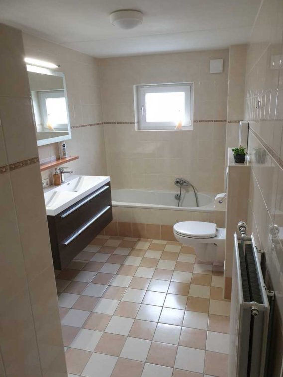 Im Obergeschoß befindet sich das Elternschlafzimmer und 2 weitere Schlafzimmer. Ein großes Bad mit Wanne und Dusche ist auch im Obergeschoß.