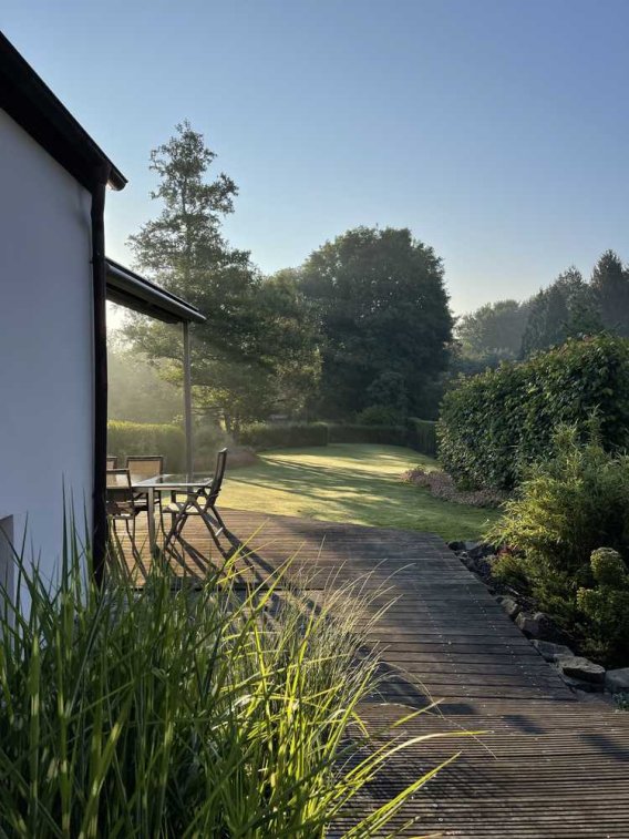 Ein absolutes Highlight ist der liebevoll gestaltete Garten: Mit geschützten Sitzplätzen, automatisierter Bewässerung, Gartenbeleuchtung, Mähroboter und einer Gartenhütte bietet er jeden Komfort – und zu jeder Jahreszeit einen beeindruckenden Blick ins Grüne. Zwei überdachte Terrassen laden zum Verweilen ein, unabhängig vom Wetter.