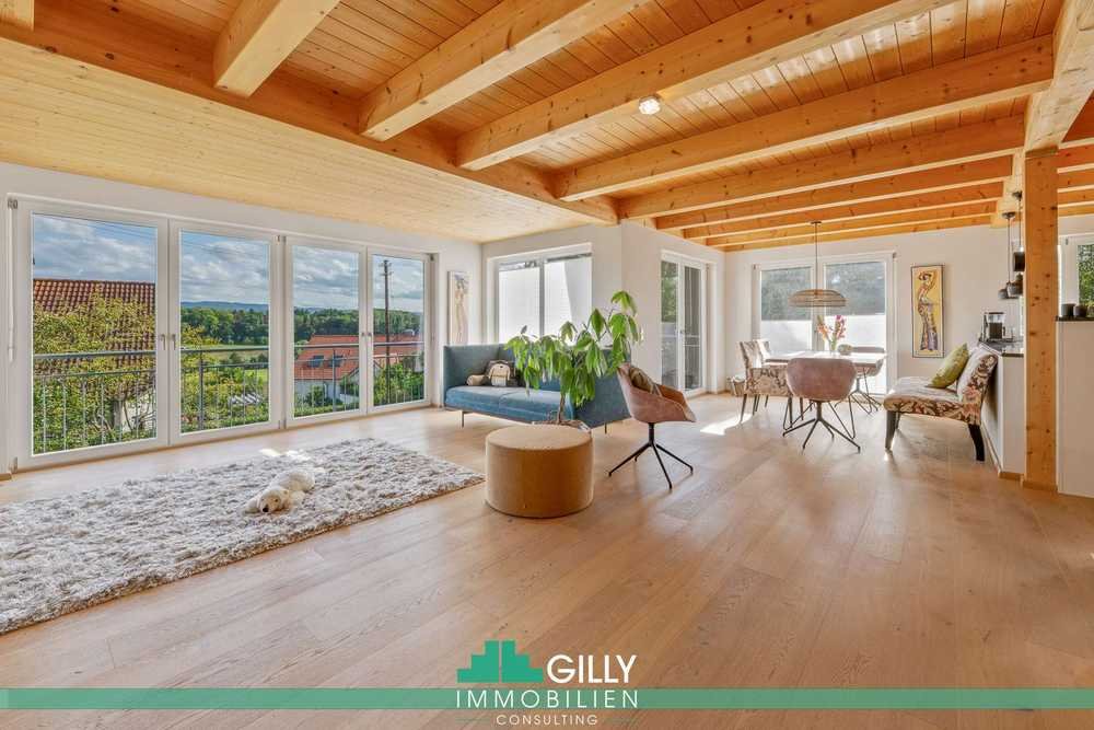 Über die freischwebende Holztreppe gelangen Sie ins Dachgeschoss. Dort erwarten Sie 4 Schlafzimmer und ein Tageslichtbad. Das Highlight ist das Richtung Garten ausgerichtete Hauptschlafzimmer mit bodentiefen Fenstern, traumhaftem Weitblick und großem Balkon, der zum Sonnenbaden und Erholen einlädt.