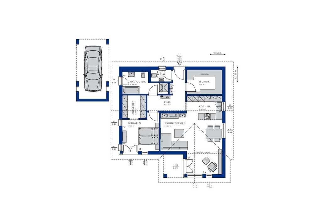 Der Bien-Zenker AMBIENCE 77 ist mehr als nur ein Bungalow; er ist Ihr persönliches Refugium, das nach Ihren Wünschen und Vorstellungen gestaltet wird. Mit einer durchdachten Raumaufteilung auf 77 m² Wohnfläche bietet dieser Bungalow alles, was das Herz begehrt. Der offene Wohnbereich schafft eine einladende Atmosphäre, in der Sie und Ihre Gäste sich wohlfühlen können. Das Schlafzimmer mit praktischer Ankleide sorgt für den nötigen Komfort und Privatsphäre, während das Badezimmer mit Dusche und Wanne zum Entspannen einlädt. Die unterschiedlichen Dachformen und Varianten, wie das Querhaus oder der Übereck-Erker, verleihen dem AMBIENCE 77 eine architektonische Vielfalt, die sich harmonisch in die Umgebung einfügt. Kompakt und funktional geplant, passt sich Ihr neues Zuhause perfekt an Ihr Grundstück an - ganz ohne Untergeschoss, sodass Sie die Vorteile des ebenerdigen Wohnens voll auskosten können.
