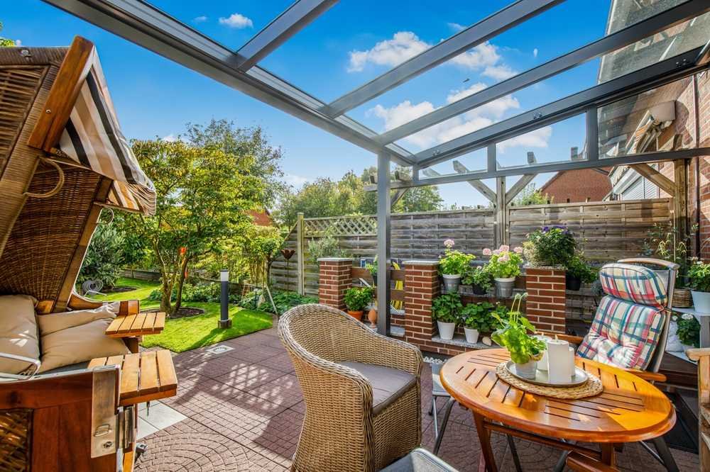 Ein besonderes Highlight ist der großzügige Garten, der von außen zugänglich ist und vielfältige Nutzungsmöglichkeiten bietet. Die überdachte Terrasse mit Glaswinterdach und Markise lädt dazu ein, den Garten wetterunabhängig zu genießen – sei es bei entspannten Stunden im Grünen oder bei geselligen Abenden mit Freunden. Ein praktisches Gartenhaus bietet zusätzlichen Stauraum für Geräte oder Fahrräder.